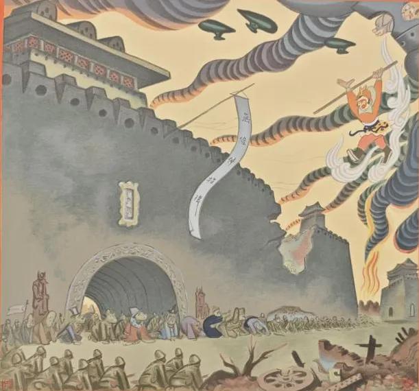 大圣念一念咒语,将身子一抖,收了毫毛,按住云头,命令气球队徐徐下降,只见伪秦城楼,竖起一面白旗,上书“无条件投降”五个大字,又只见众多伪官伪兵,尽皆跪在城边,哀哀乞降。大圣命令他们报名自首,将全部武器限日交出,不得有藏匿移走等情,如敢故违,定斩不饶。骇得众伪官们连连称诺。