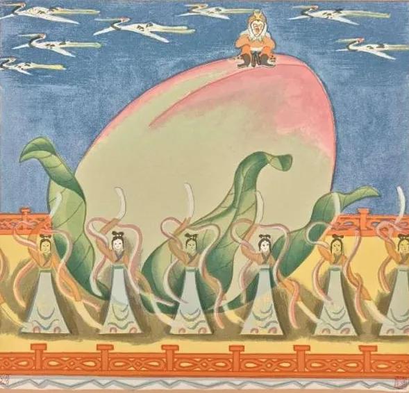 转动渐渐的缓和下来,悟空耳朵边听得音乐悠扬,觉得身子又滑进一个地方,又听见拍手喝彩的声音:“好一个偷桃的猴子来了!”睁眼一看原来置身在一只大蟠桃上,四周围绕着诸天大罗神仙,上面端坐着西王母仙驾,才恍然悟道:“怎么又会来到南天门咧?”一下子一列彩衣仙女围着蟠桃又跳起舞来。