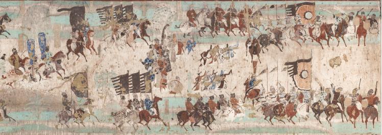 此图绘制于莫高窟第156窟南壁,为张淮深纪念其叔父张议潮所建之功德窟。唐大中五(851)年唐宣宗敕封驱逐吐蕃收复河西的张议潮为河西十一州节度使。此图便是他受封为节度使后出行的仪仗场面。画面长卷式构图,全长8.5米,主要由仪仗先导、张议潮骑马过桥、辎重后勤部队,三部分构成。张议潮戴幞头,红袍革带,骑马过桥,其侧有:“河西十一州节度使张议潮□除吐蕃收复河西一行图”榜题,其形式与唐太宗骑马过金桥的“金桥图”相仿。画卷中人物逾百、骏骑八十余,出行队伍旌旗飘扬,延绵浩荡,显示了这支队伍的严整军仪和威武雄风。是一幅珍贵的历史画卷,呈现出时代和地域的鲜明特点。
