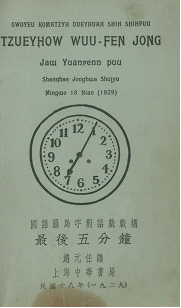 《最后五分钟》是赵元任1927年用北京口语编译的一本独幕剧戏谱,也是他语言实验与艺术实践的重要成果。该剧根据英国著名作家A. A. Milne(米尔恩)的剧本The Camberley Triangle(《坎伯利的三角恋爱》)改编,将故事背景与人物进行了本土化处理。同年4月,赵元任亲自导演此剧,并在清华大礼堂第一次公演,演员均为清华学生,生动实践了他所倡导的国语标准化理念。1929年,这本戏谱由中华书局出版,书名全称为《国语罗马字对话戏戏谱 最后五分钟 一出独折戏 附:北平语调的研究》,长达28字,书后附有赵元任的学术论文《北平语调的研究》。作家汪曾祺曾盛赞这是“一本妙书”。
