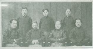 清华国学研究院教授王国维(前左二)、梁启超(前右二)、赵元任(前右一),讲师李济(前左一)。