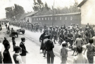 1938年4月28日,湘黔滇旅行团路过昆明拓东路。长沙临时大学284名由男生组成的湘黔滇旅行团于当年2月20日离开长沙,4月28日抵达云南昆明,旅途68天,全程1663.6公里,除休息及乘车船外,实际步行40天,每天平均约32.5公里。