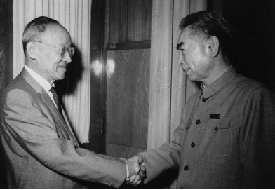 1973年5月13日晚,周恩来总理在人民大会堂会见赵元任夫妇,并进行亲切谈话。