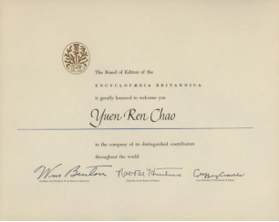 1960年,赵元任先生为《大英百科全书》(Encyclopaedia Britannica)撰写“中国语言(Chinese Language)”条目。大英百科全书编辑部(Board of Editors Encyclopaedia Britannica)为赵元任先生颁发致谢证书。