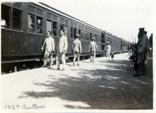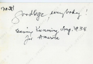 1938年8月1日,赵元任全家乘火车离开昆明,辗转赴美国夏威夷大学。赵元任在照片背面注:“Goodbye, everybody! Leaving Kunming Aug. 1938 for America”。