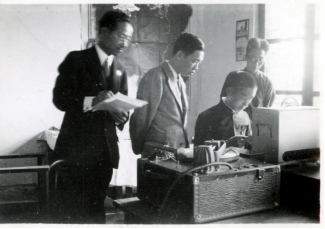 1935年10-11月,赵元任、杨时逢、葛毅卿三人到湖南进行方言调查。26天里,对75个县的方言完成第一次调查,灌制了144张双面留声片。图中赵元任(左一)、杨时逢(左二)、葛毅卿(右一)在听湖南人发音(1935年10月)。