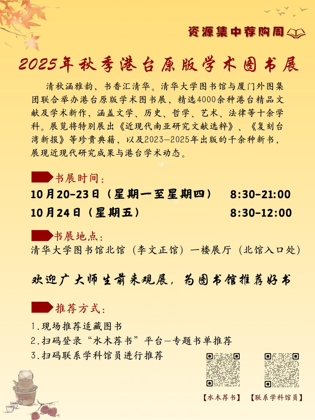 清秋涵雅韵,书香汇清华。清华大学图书馆与厦门外图集团联合举办港台原版学术图书展,精选4000余种港台精品文献及学术新作,涵盖文学、历史、哲学、艺术、法律等十余学科。展览将特别展出《近现代南亚研究文献选粹》、《复刻台湾新报》等珍贵典籍,以及2023-2025年出版的千余种新书,展现近现代研究成果与港台学术动态。