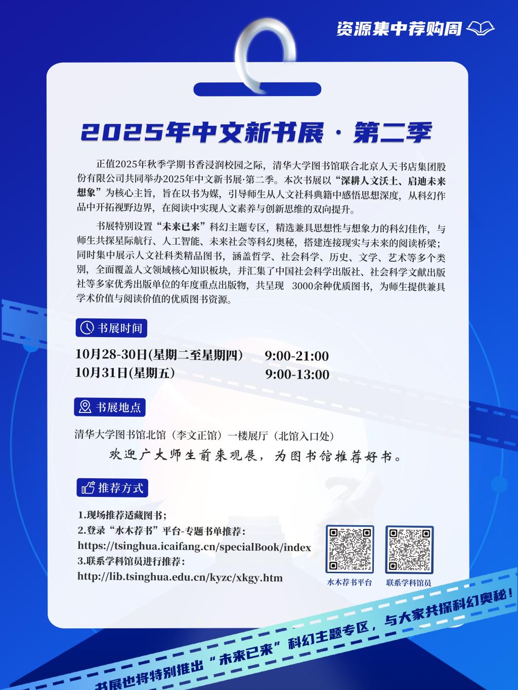 正值2025年秋季学期书香浸润校园之际,清华大学图书馆联合北京人天书店集团股份有限公司共同举办2025年中文新书展·第二季。本次书展以 “深耕人文沃土、启迪未来想象” 为核心主旨,旨在以书为媒,引导师生从人文社科典籍中感悟思想深度,从科幻作品中开拓视野边界,在阅读中实现人文素养与创新思维的双向提升。