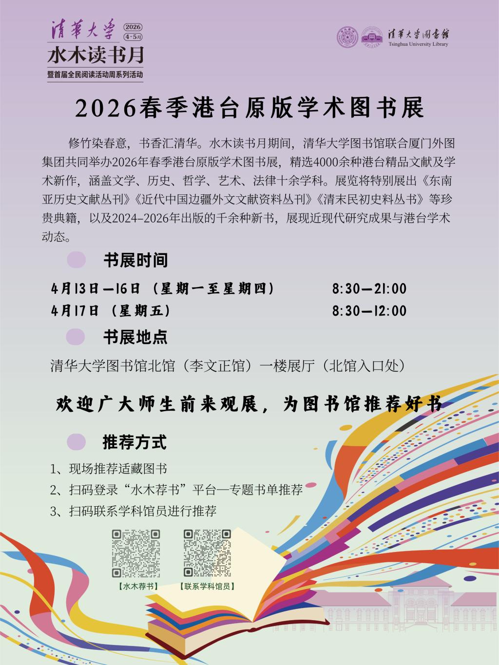 修竹染春意,书香汇清华。水木读书月期间,清华大学图书馆联合厦门外图集团共同举办2026年春季港台原版学术图书展,精选4000余种港台精品文献及学术新作,涵盖文学、历史、哲学、艺术、法律等十余学科。展览将特别展出《东南亚历史文献丛刊》《近代中国边疆外文文献资料丛刊》《清末民初史料丛书》等珍贵典籍,以及2024–2026年出版的千余种新书,展现近现代研究成果与港台学术动态。