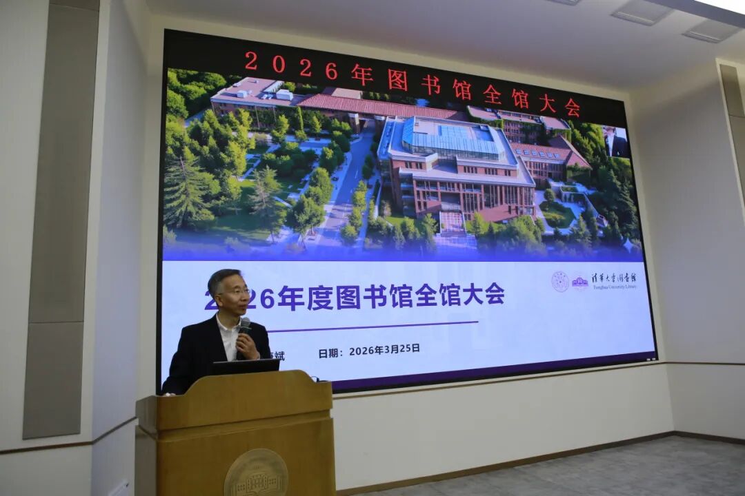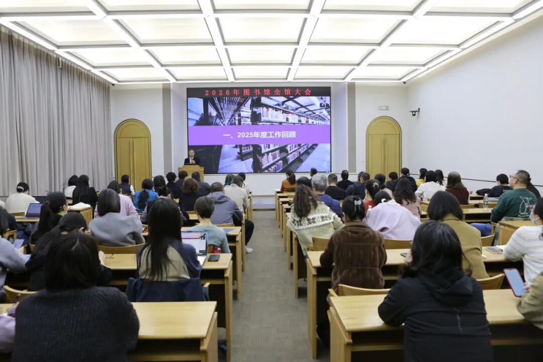 3月25日下午,2026年图书馆全馆大会在报告厅举行。馆长金兼斌代表党政班子作工作报告,全面总结过去一年的工作,并对2026年重点推进工作进行整体部署。党委副书记窦天芳主持会议。此次会议采取线上线下相结合的形式举行,全馆员工参会。