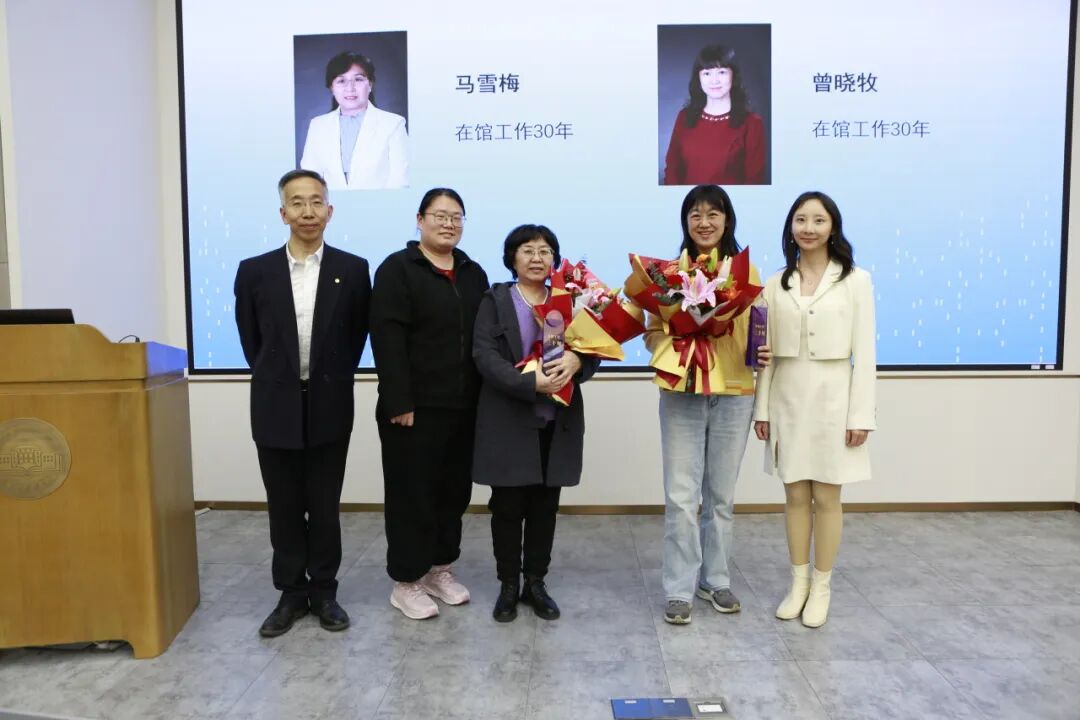 会上还颁发了“在馆工作三十年荣誉纪念”,该荣誉旨在感谢馆员三十年来的忠诚与奉献为图书馆的发展奠定了坚实的基础。本次获得者文科图书馆马雪梅、信息参考部曾晓牧老师均为1995年来馆,并在馆内多个部门工作过。金兼斌为两位老师颁奖,年轻馆员范林林、田兆雪献上鲜花。