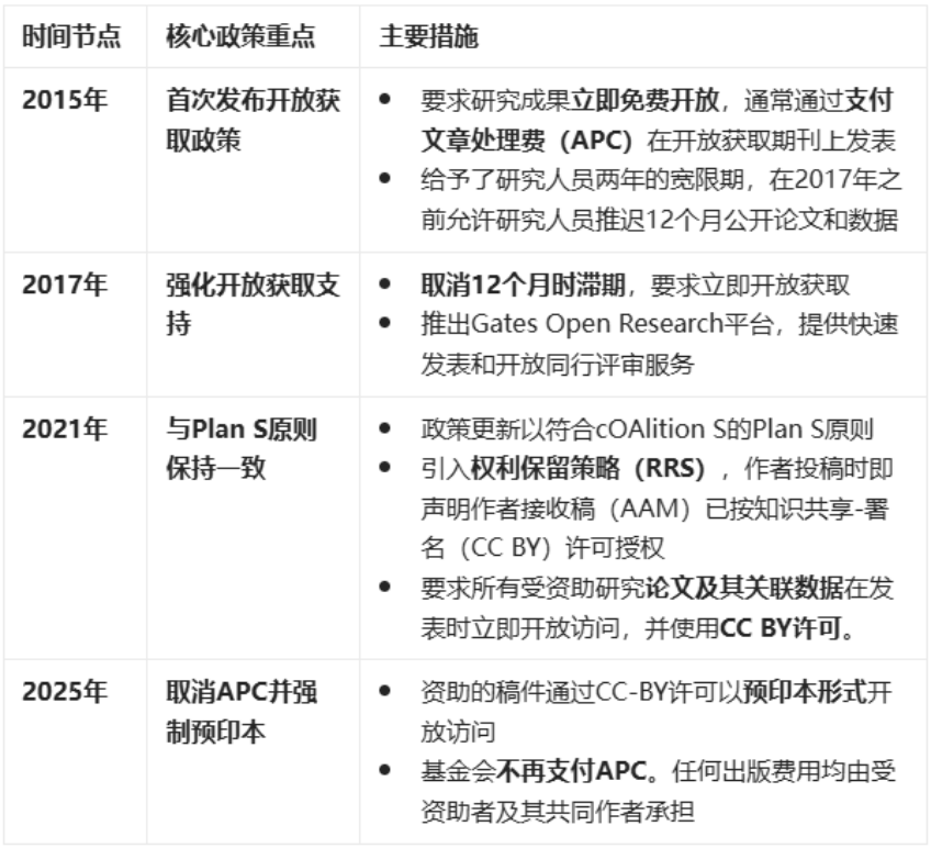 盖茨基金会的开放获取政策经历了明显的阶段性调整,其核心转折点如下: