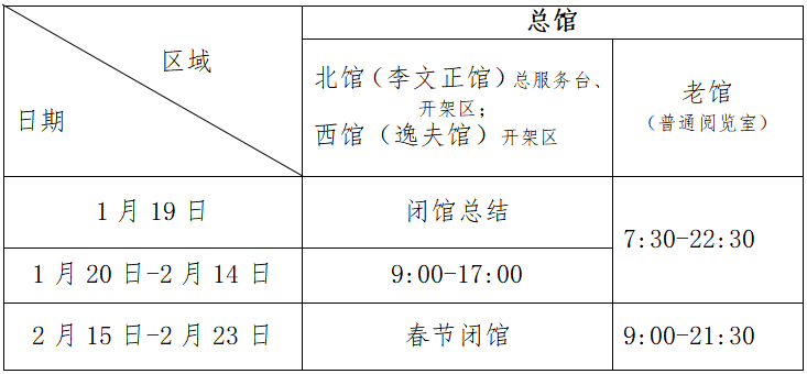 注:老馆服务台、古籍阅览室1月22日-2月23日暂停服务。