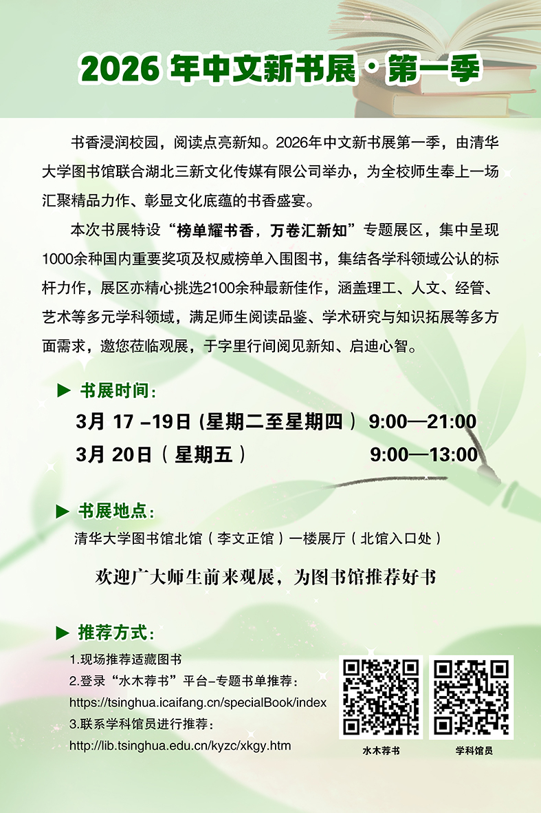 书香浸润校园,阅读点亮新知。2026年中文新书展第一季,由清华大学图书馆联合湖北三新文化传媒有限公司举办,为全校师生奉上一场汇聚精品力作、彰显文化底蕴的书香盛宴。